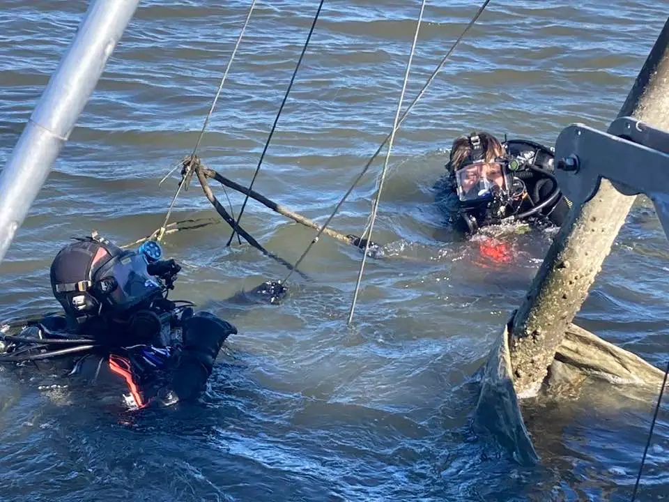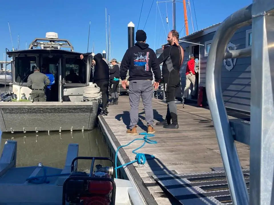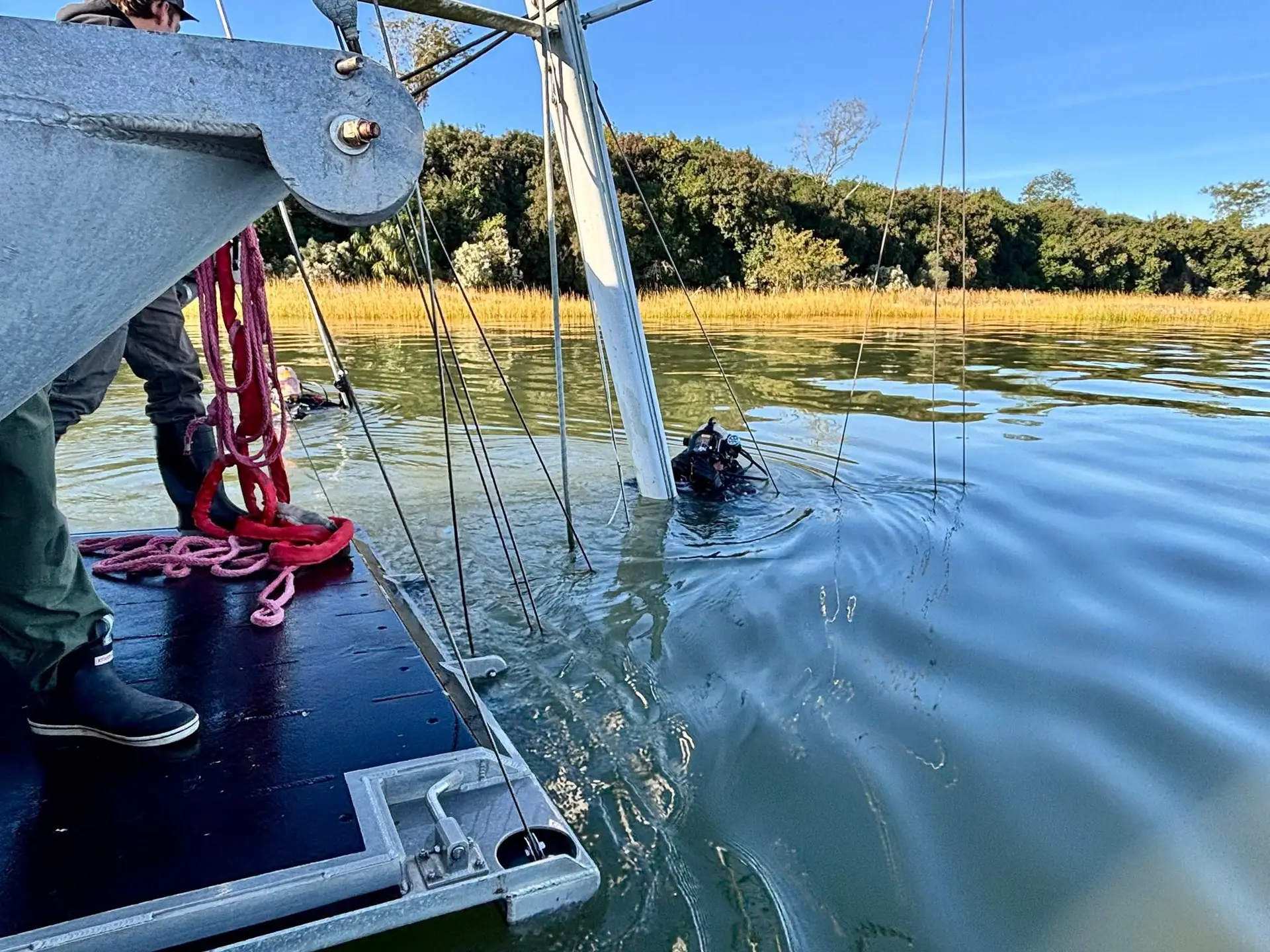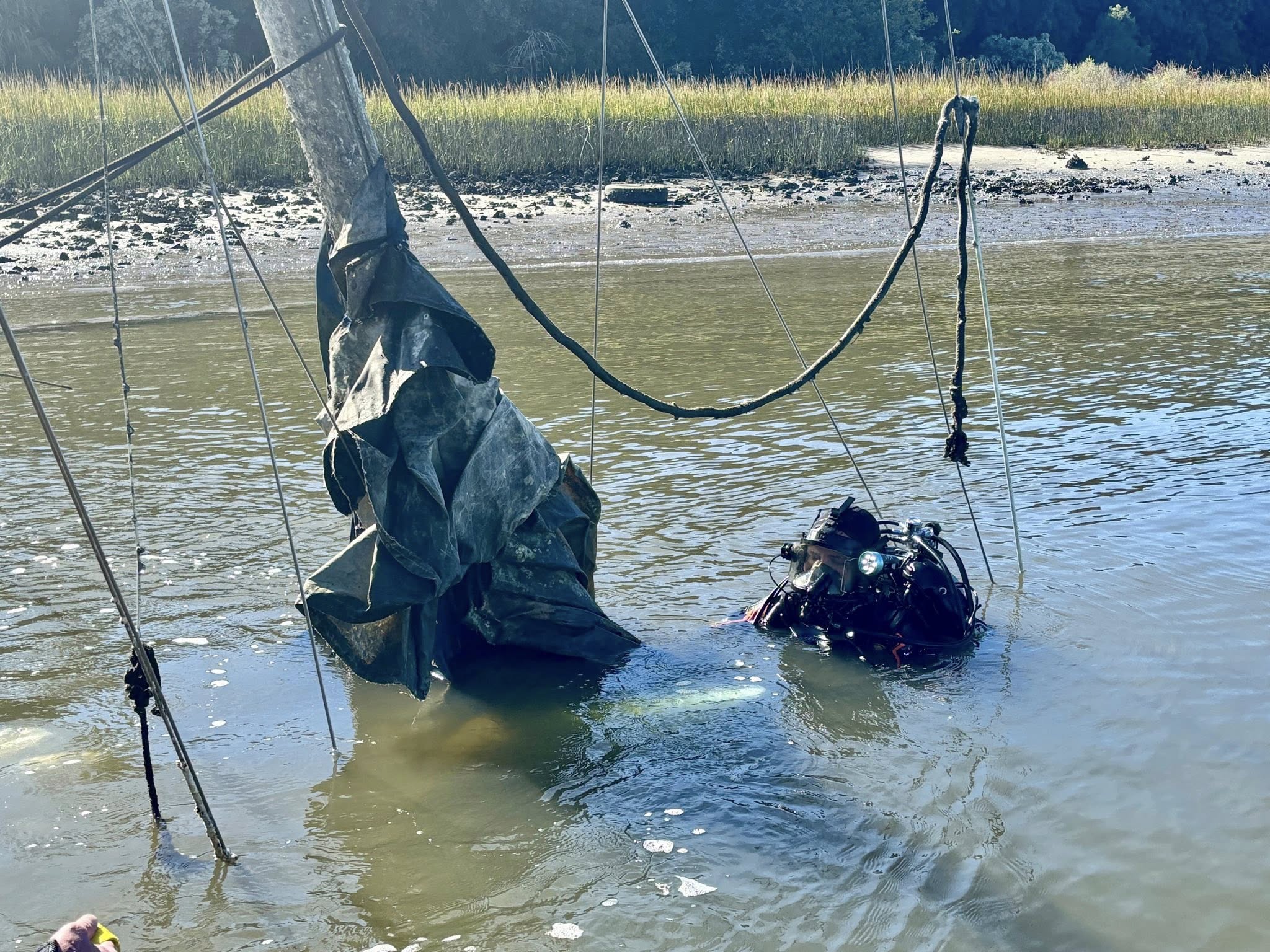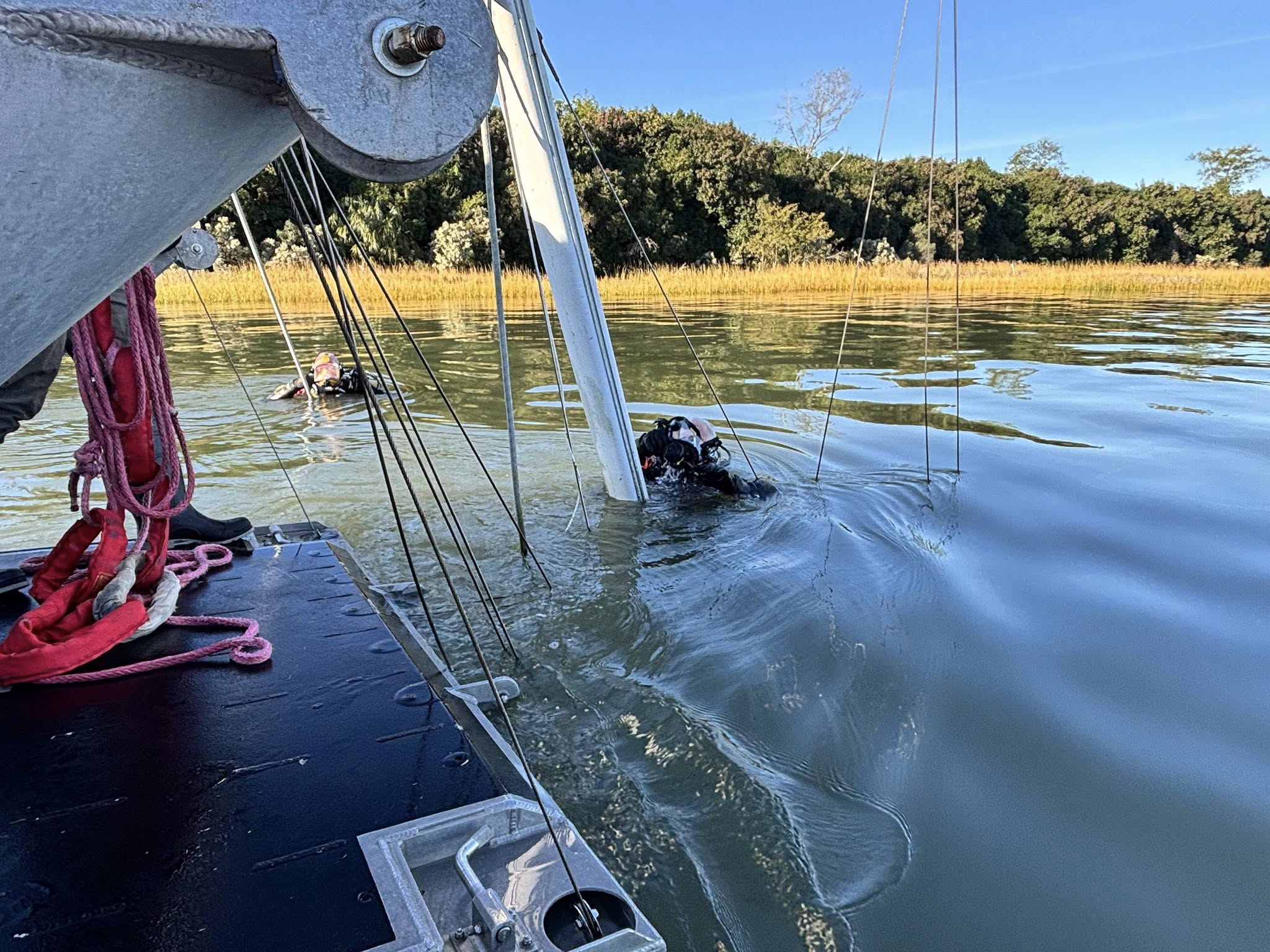 This first boat for them to learn on was perfect. It was in a good spot where there is a strong current and not too deep. It also had numerous entanglement issues with the mast and deck rail cables, combined with a shredded mast that seemed to be everywhere. It provided the opportunity to learn, while also easily rescuing any diver who may have gotten into trouble.